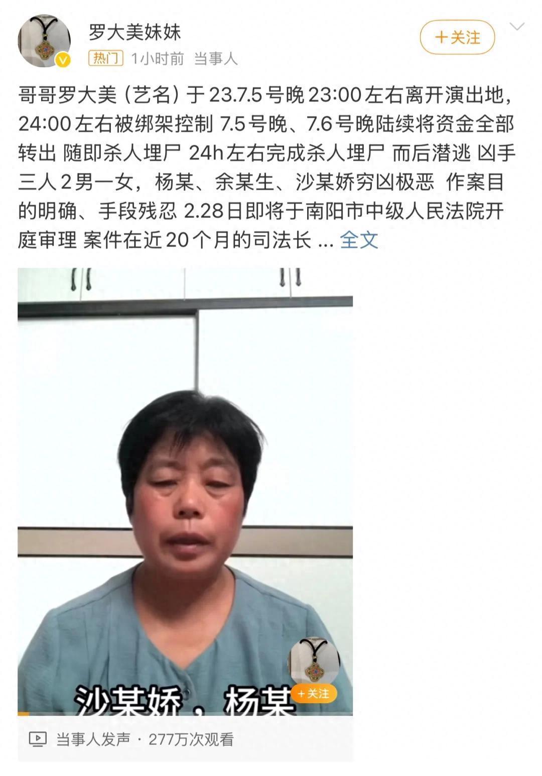 2月22日晚,@罗大美妹妹 发文称,案件将于2月28日在南阳市中级人民法院开庭审理。“罗大美”母亲表示要让三名凶手受到法律应有的制裁。